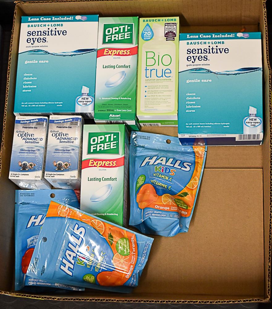 FLAT LOT OF COUGH DROPS AND EYE CARE PRODUCTS