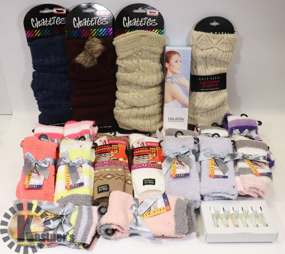 4 PAIR LEG WARMERS, THERMAL SOCKS SIZE 9-11 W/GALLIVANT NOMAD SET OF 6 SAMPLERS KIT 2ML VIALS (EUROPE). HOME