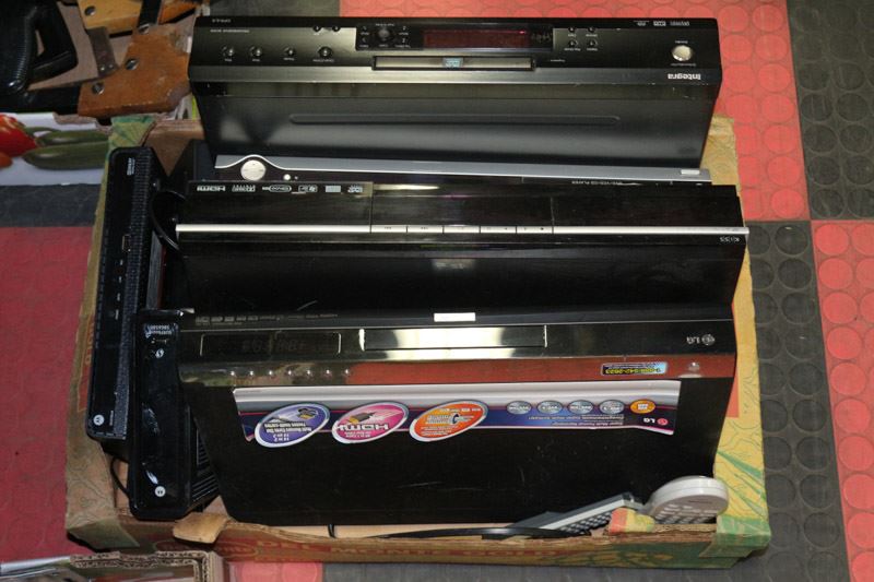 FLAT OF 5 DVD PLAYERS, REMOTES, CABLE BOXES &MODEM