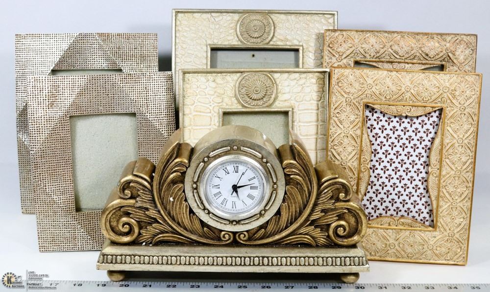 FLAT OF 6 SHOWHOME PICTURE FRAMES AND MANTLE CLOCK