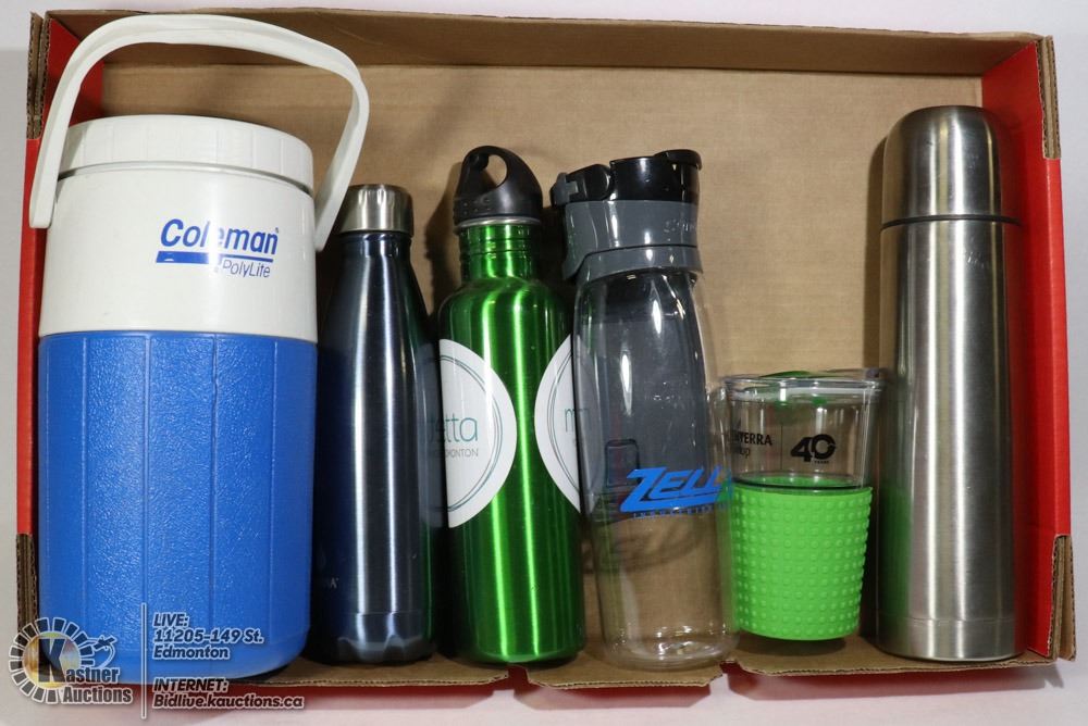 FLAT OF 6 THERMOS,WATER BOTTLES,COLEMAN JUG