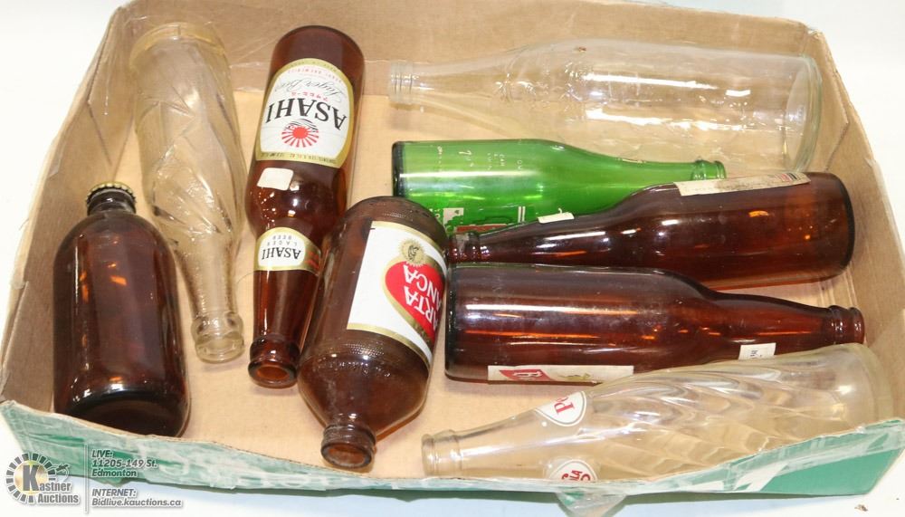 FLAT OF 9 VINTAGE POP AND BEER BOTTLES