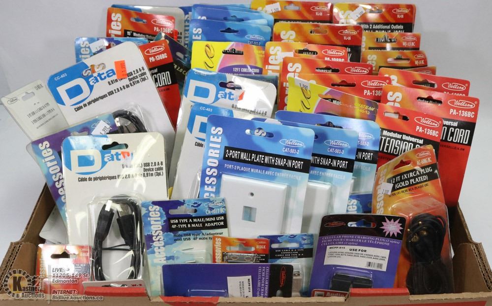 FLAT OF ASSORTED CABLES PHONE CORDS AND MORE