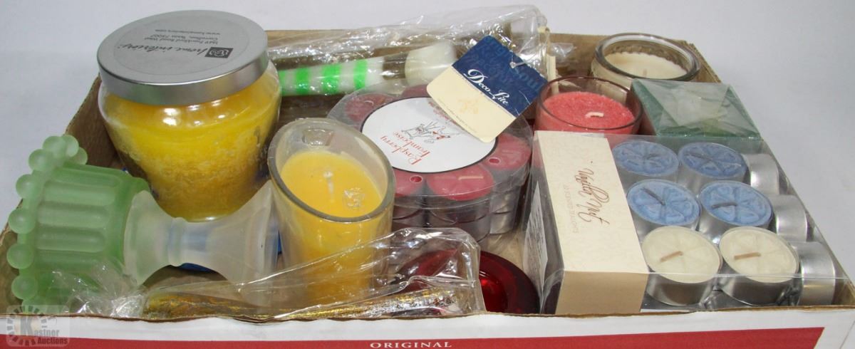 FLAT OF ASSORTED CANDLES ,HOLDERS,ETC