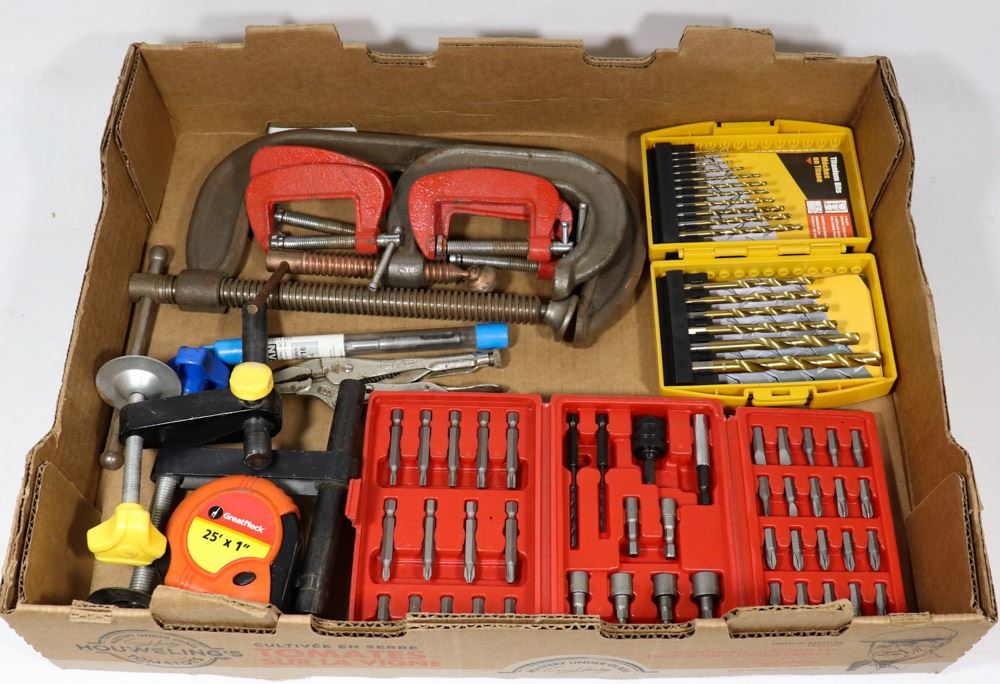 FLAT OF ASSORTED CLAMPS, BITS, AND MORE