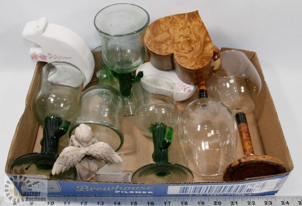 CACTUS WINE GLASSES, TWO HAND MADE WOOD HANDLED WINE GLASSES, SARAH'S ANGEL FIGURE AND MORE.