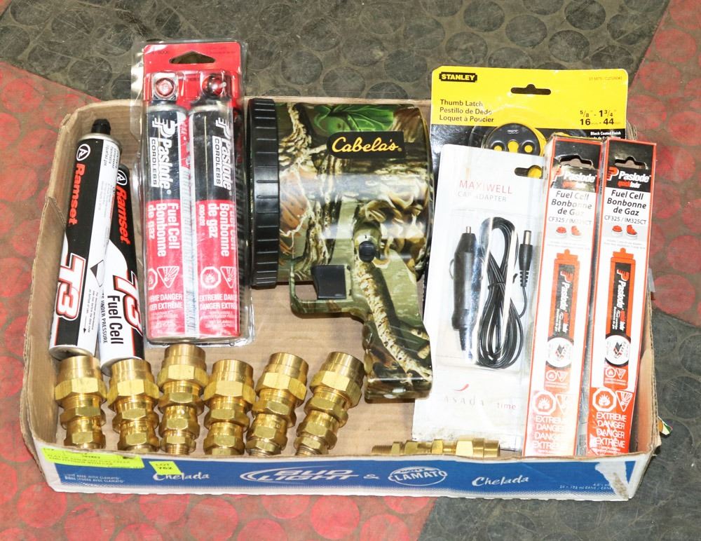 ADAPTOR, STANLEY THUMB LATCH AND ONE CAMO CABELAS 1 MILLION CANDLE WATT CORDLESS SPOT LIGHT. GENERAL