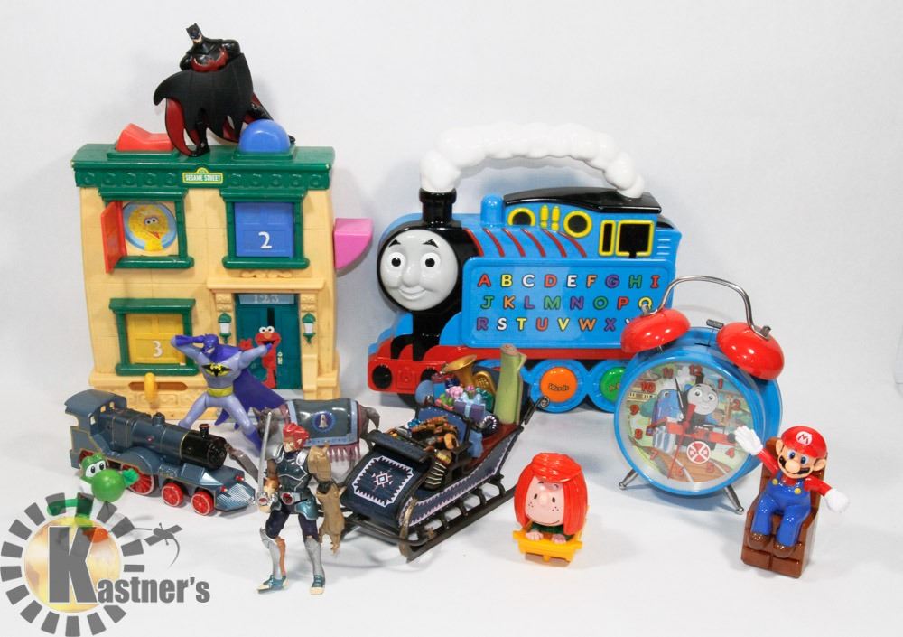 TRAIN LEARNING TOY (WITH BATTERIES, WORKS), THOMAS CLOCK (WORKS), SESAME STREET LEARNING TOY ( NO BATTERIES, UNTESTED), AND ASSORTED ACTION FIGURES. KIDS - TOYS