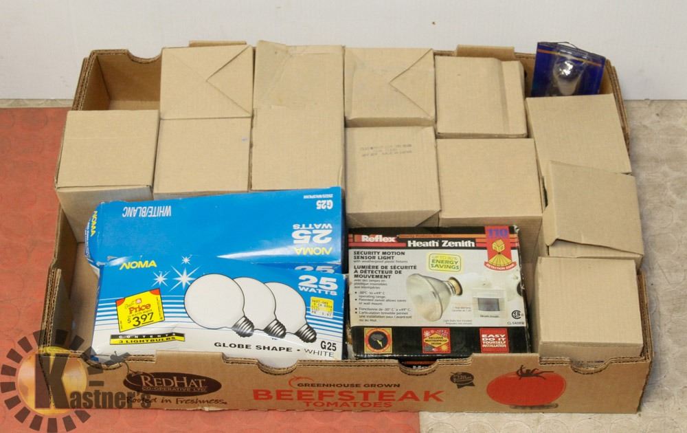 FLAT OF ASSORTED LIGHT BULBS AND SECURITY LIGHT