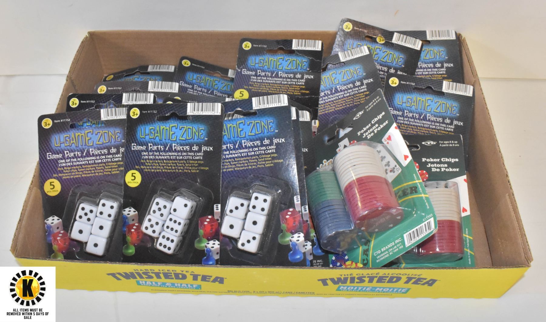 FLAT OF ASSORTED PACKS DICE & POKER CHIPS