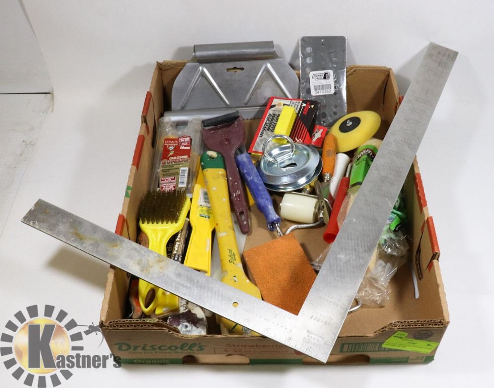FLAT OF ASSORTED PAINTING ITEMS AND BBQ BRUSH