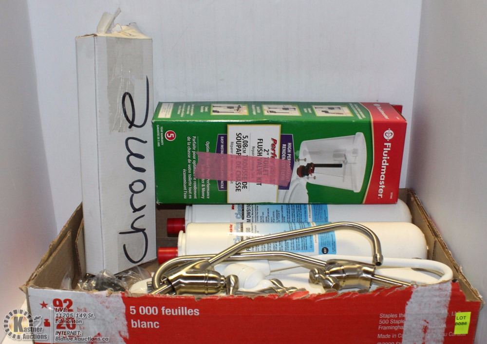 6-WATER TAP FIXTURES, 5-CHROME, 1-WHITE 2-WASTEKING INLINE WATER FILTRATION CARTRIDGES - CHEMICAL/MECHANICAL REDUCTION FILTERS 1-2" WATER FLUSH VALVE KIT