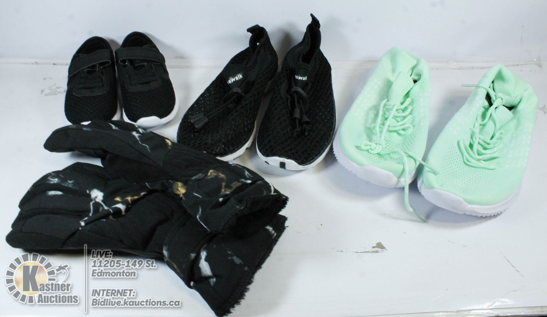 FLAT OF ASSORTED SIZED SHOES AND 1 PAIR OF GLOVES