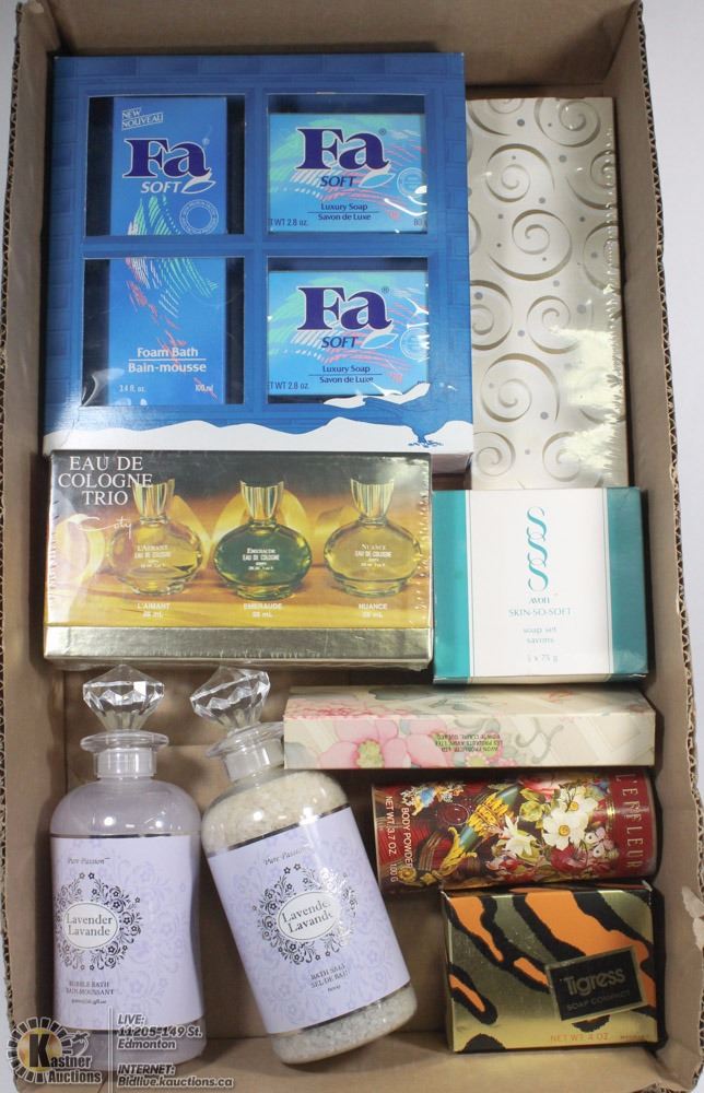 FLAT OF ASSORTED SOAPS AND BATH ITEMS