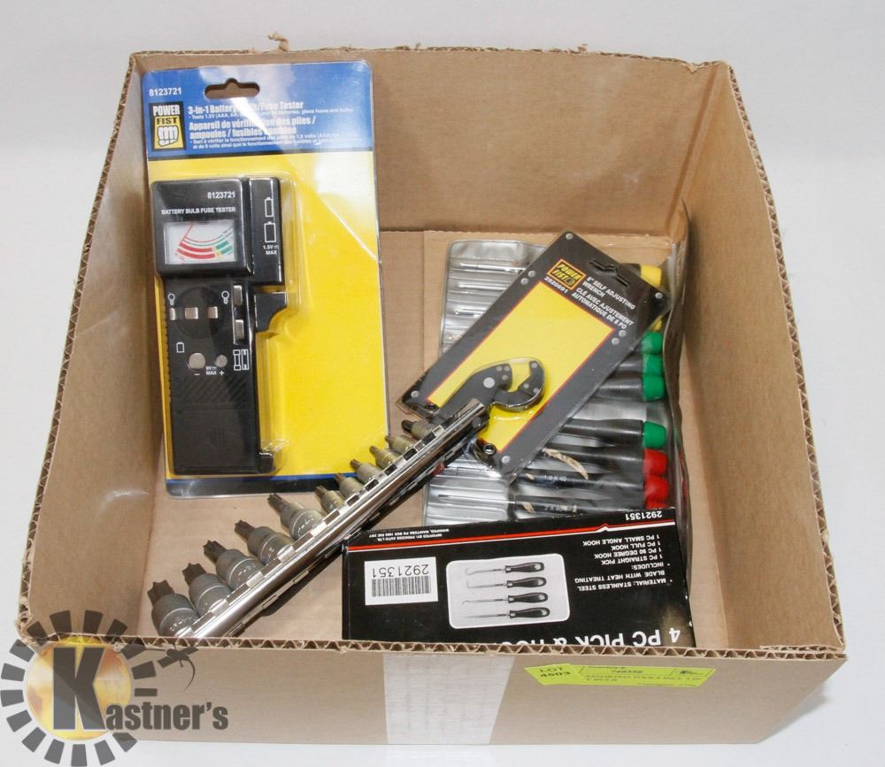 FUSE TESTER, 4PC PICK AND HOOK SET, 12PC MICRO SCREWDRIVER SET AND MORE.