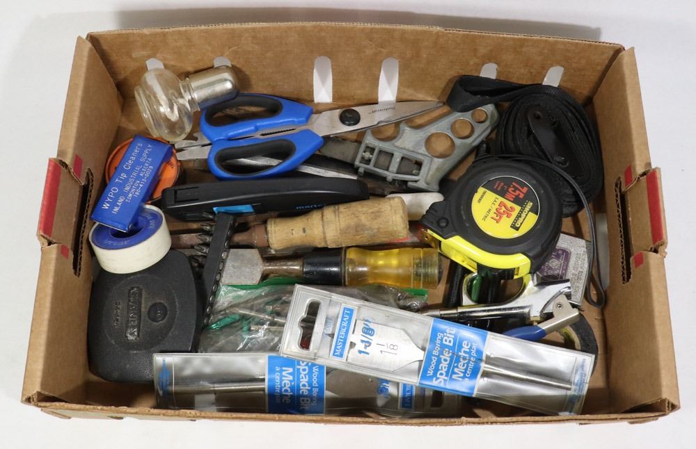 FLAT OF ASSORTED TOOLS INCLUDING TAPE MEASURE,