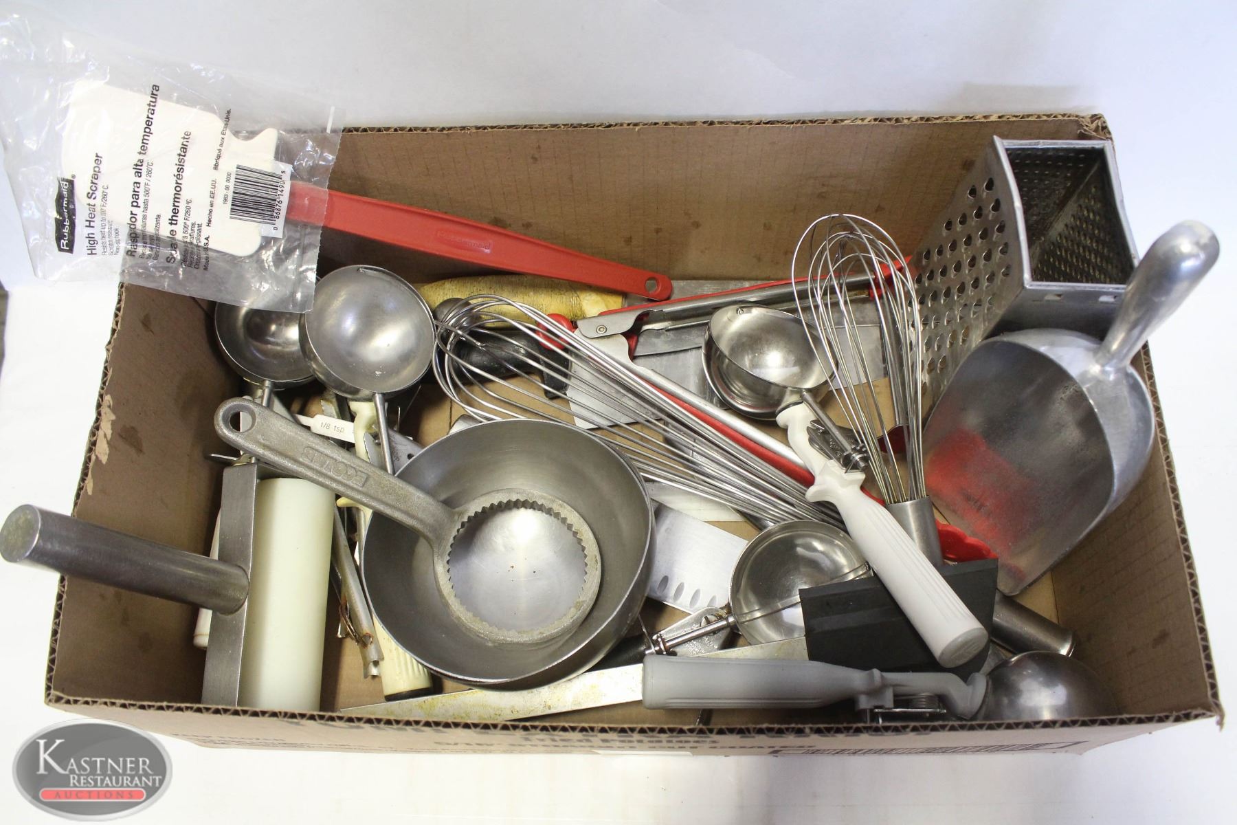 RUBBERMAID HIGH-HEAT SCRAPER / SPATULA, WHISKS, S/S MINI-ROLLER, TONGS, MEASURE SCOOPS, TWO KNIVES + MORE