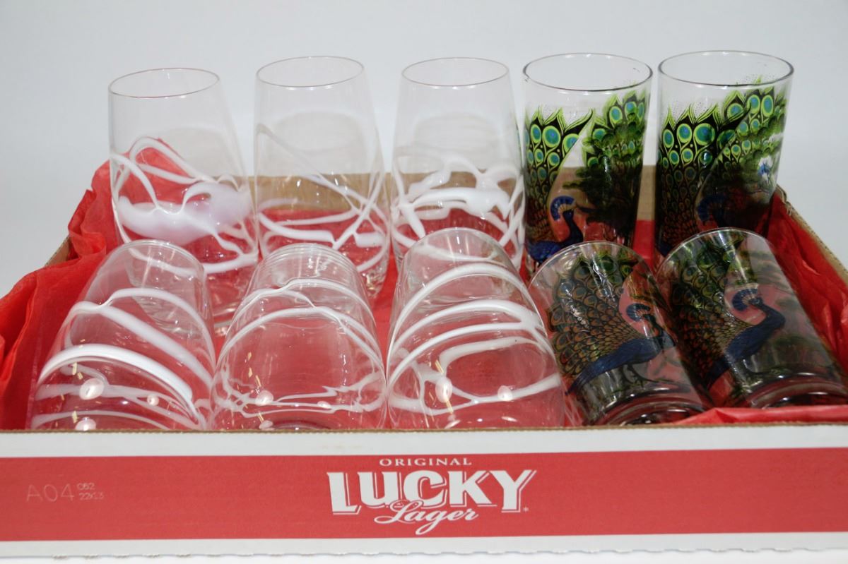 FLAT OF BLOWN GLASSES AND PEACOCK GLASSES