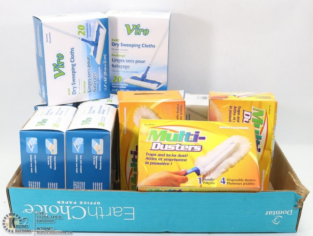 8 BOXES OF 20 DRY SWEEPING CLOTHS , 3 BOXES OF MULTI DUSTERS ALL NEW UNOPENED BOXES