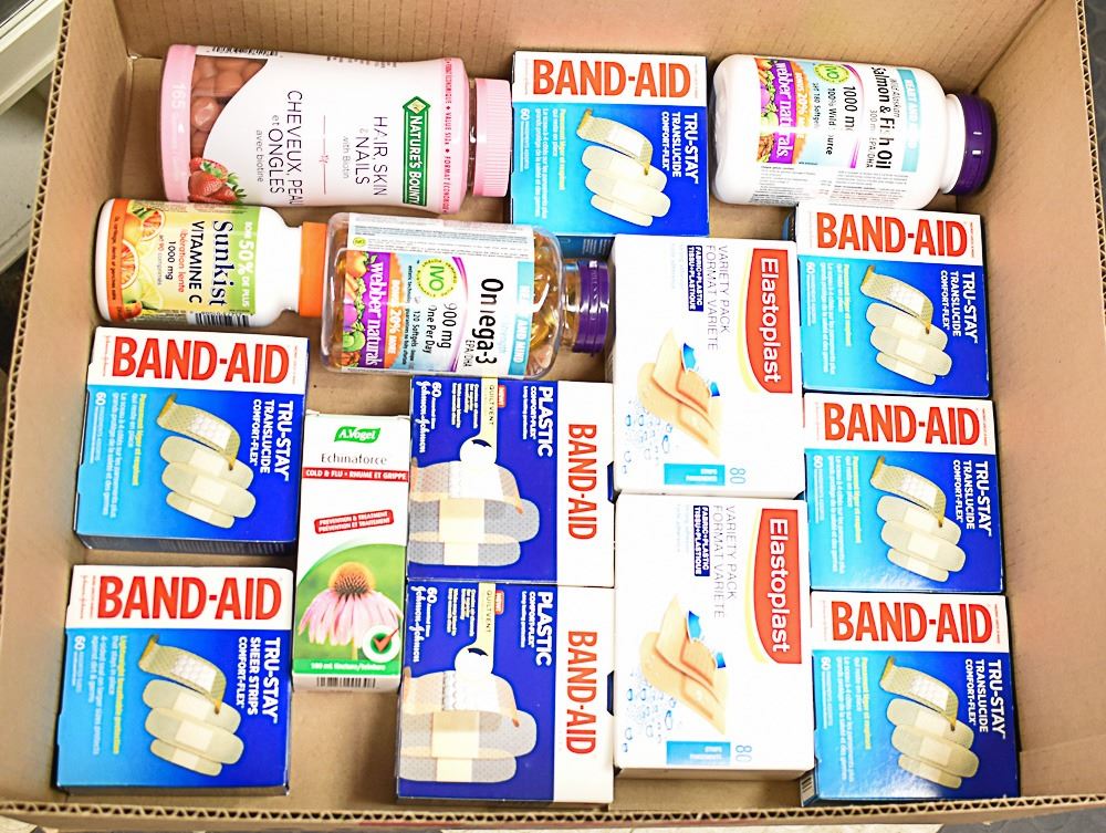FLAT OF BRAND NAME VITAMINS AND BAND-AID LOT