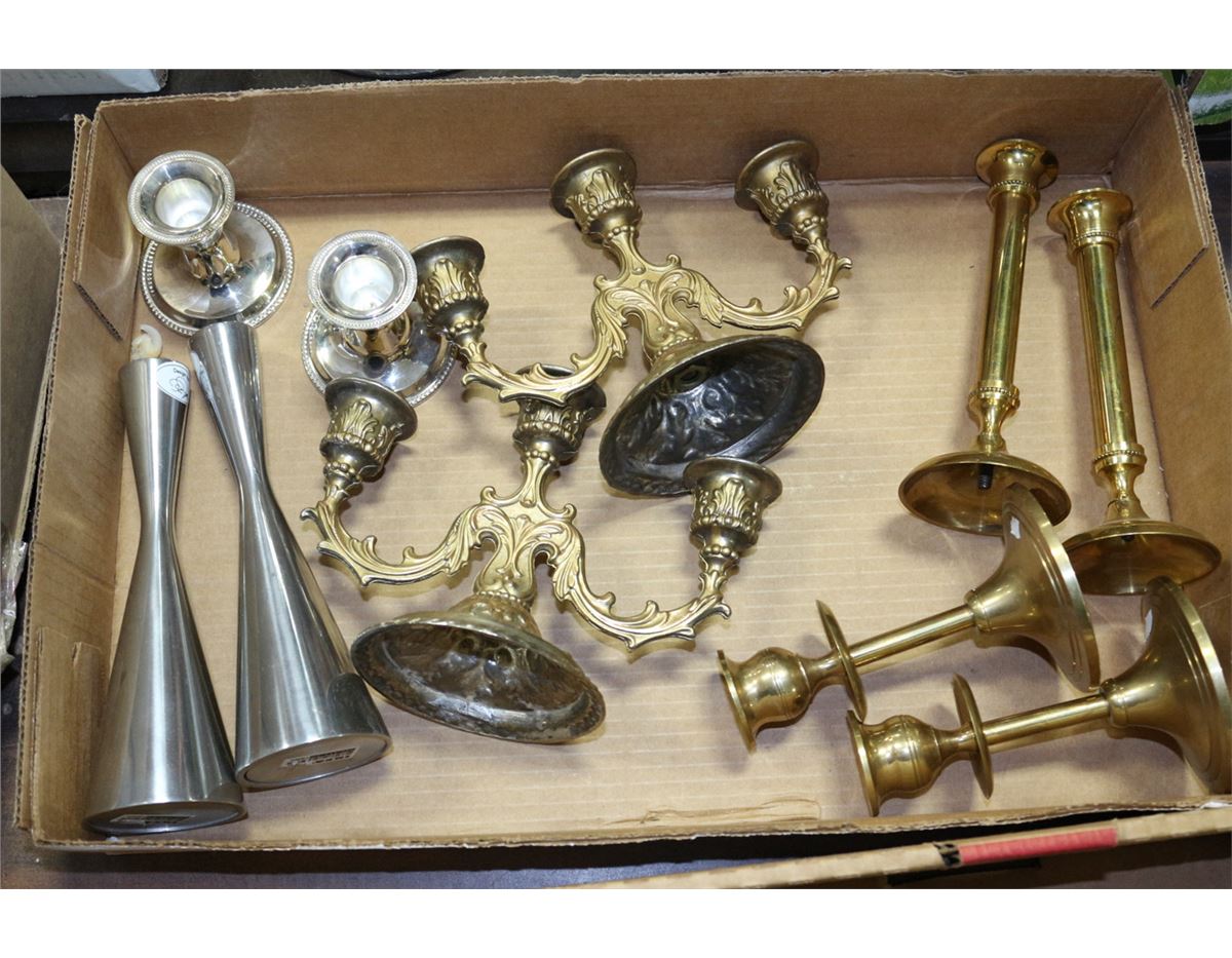 FLAT OF BRASS & SILVER CANDLE HOLDER & CANDELABRA