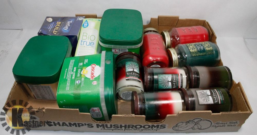 FLAT OF CANDLES, DISH TABS, AND MORE