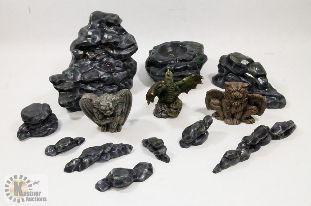 FLAT OF CERAMIC ROCKS, GARGOYLES, DRAGON FIGURES