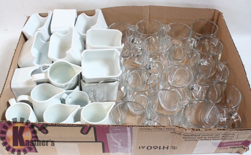 FLAT OF CLEAR COFFEE MUGS, SUGAR CADDIES & CREAM