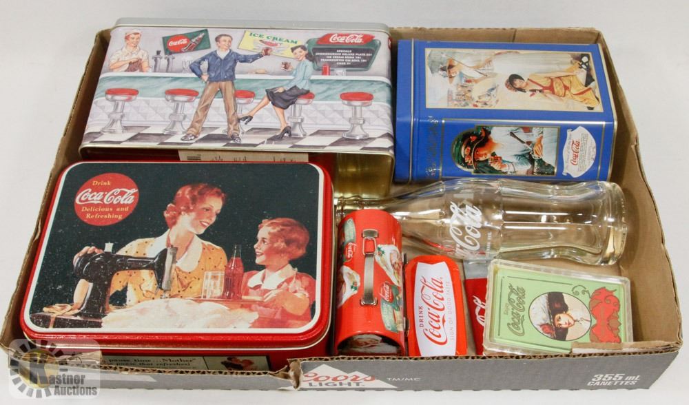 4 TINS, LUNCH KIT, PLAYING CARDS, BOTTLE, PENS SET, BOXCUTTER. COLLECTIBLES.