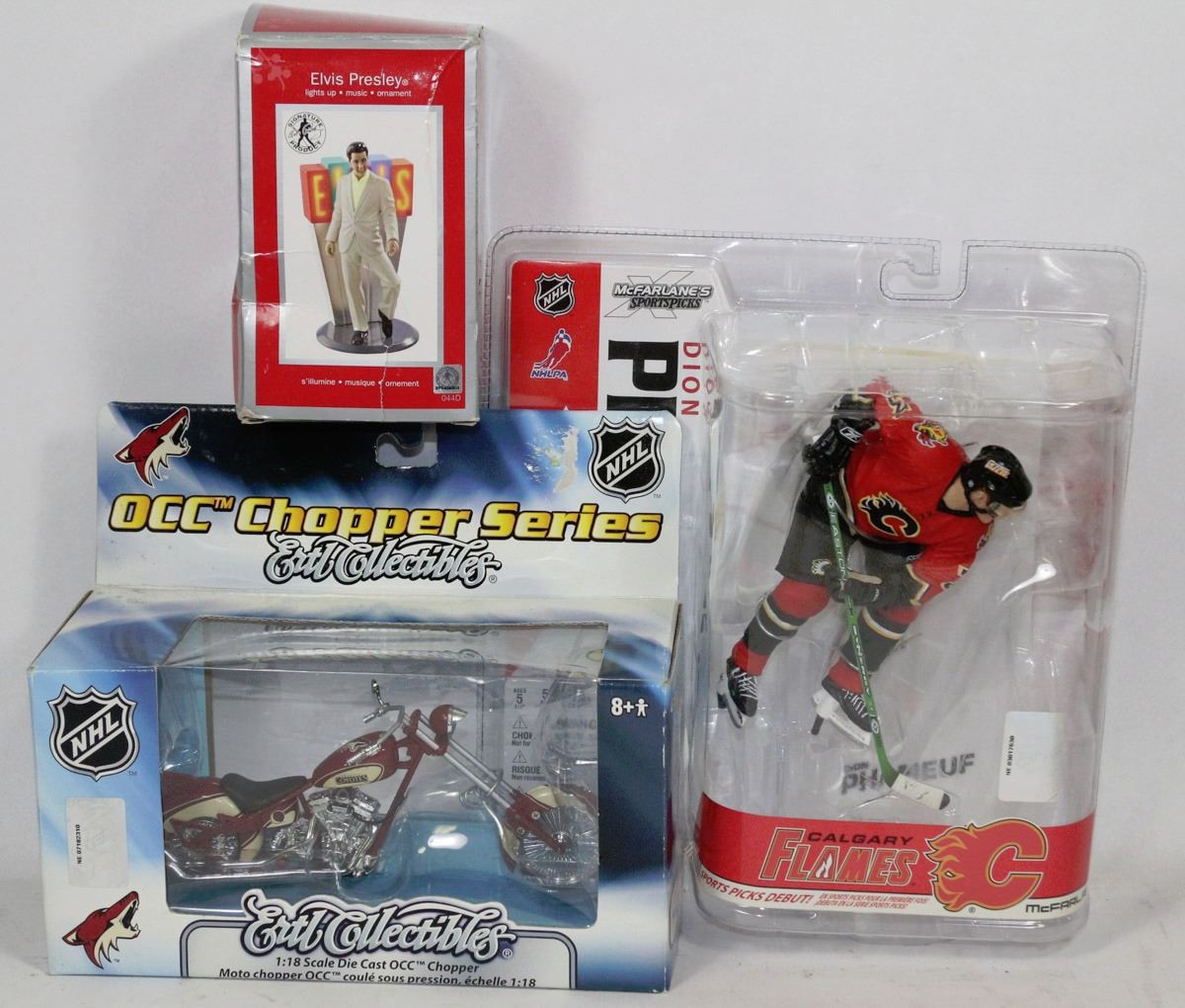 NHL CHOPPER, ELVIS ORNAMENT & CALGARY FLAMES FIGURINE