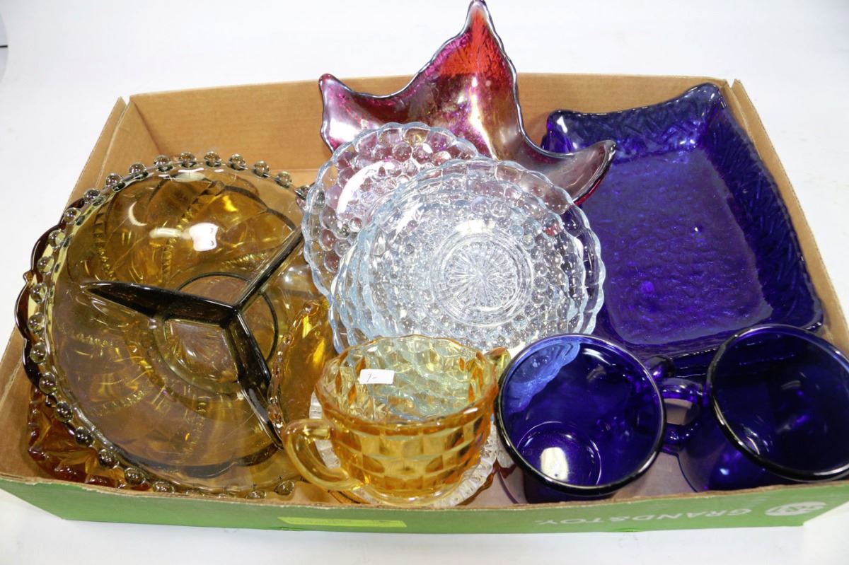 FLAT OF COLORED GLASS ITEMS - SOME VINTAGE