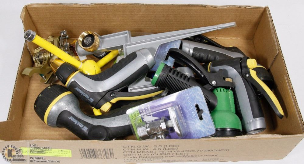 FLAT OF DIFFERENT GARDEN TOLLS INCL NOZZLES ETC