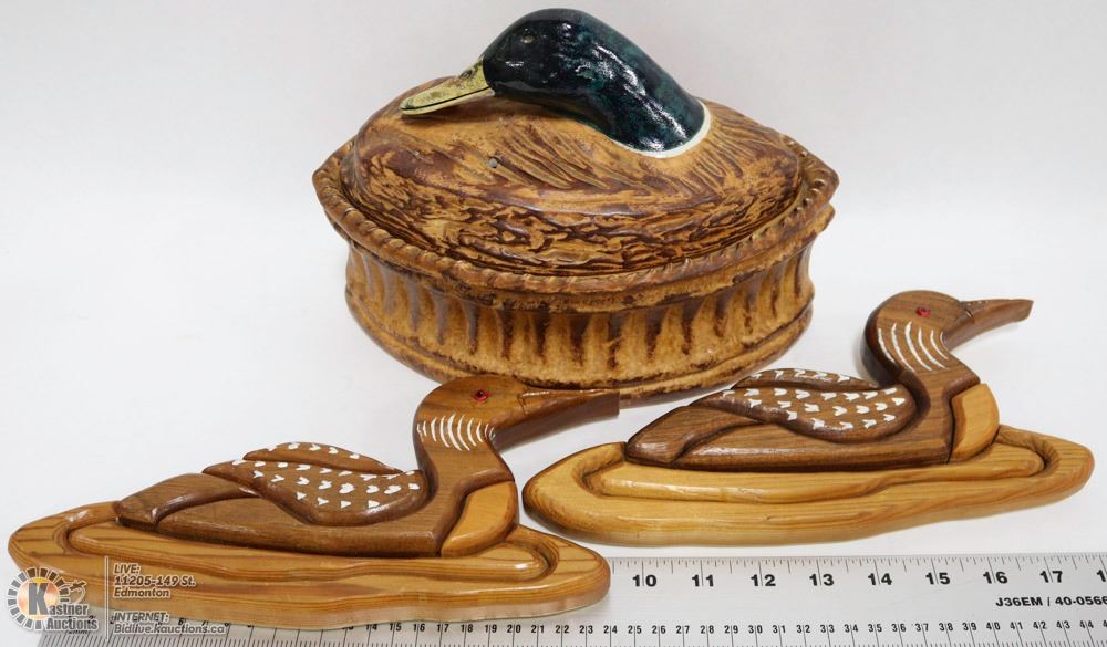 LARGE COOKIE JAR (SOUP TOUREEN) AND A PAIR OF WOOD PUZZLE WALL DÉCOR