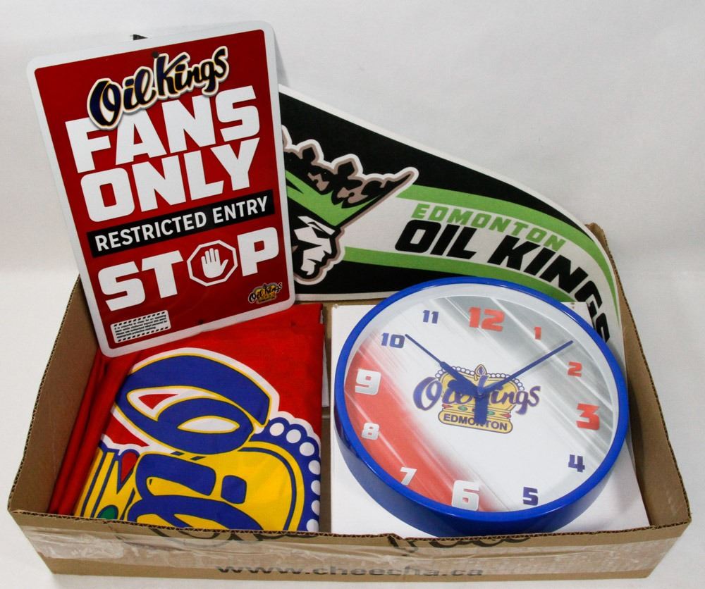 2 OIL KING FLAGS 2' X 3'; METAL OIL KING FAN PARKING SIGN 8” X 12”; NEW BOXED OIL KING CLOCK; OIL KING PENNANT 29” LONG. COLLECTIBLES.