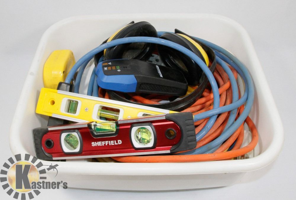 FLAT OF EXTENSION CORDS, LEVELS, AND MORE