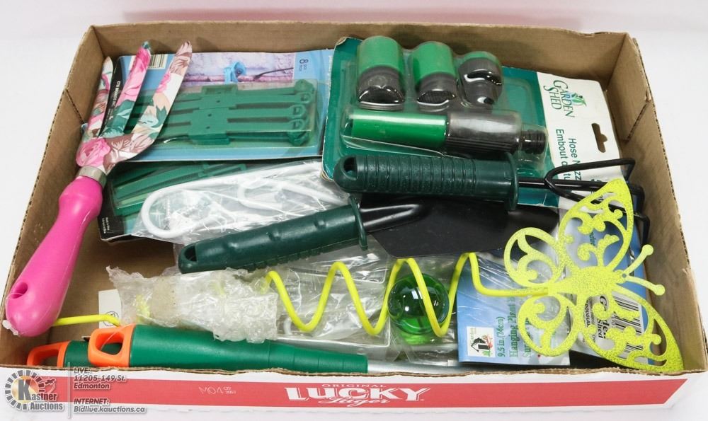 RAKES, CLAW, WEEDING KNIFE, HOSE QUICK CONNECT, PLANT TIES, HANGING PLANT BRACKETS, ETC. OUTDOORS.