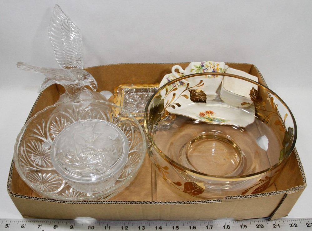 VINTAGE SUNBURST GLASS BOWL, GOLD TRIMMED NESTING ASHTRAYS, GOLD EMBOSSED FRUIT/SALAD BOWL, ROYAL WINTON CREAM & SUGAR & TRAY, CANDY DISH, GLASS EAGLE. HOUSEHOLD. COLLECTIBLES.