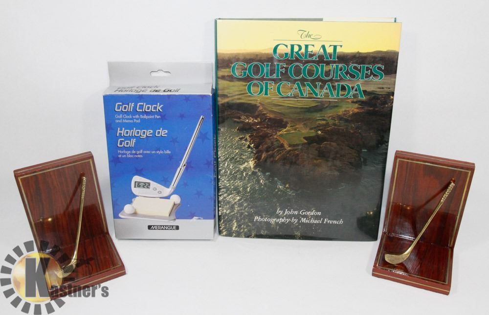 BOOKENDS, GOLF CLOCK, AND HARDCOVER CANADIAN GOLF COURSES BOOK. GENERAL - SPORTS