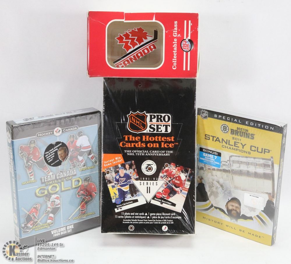 2 SETS NHL SEALED DVDS W/CANADA WORLD JUNIORS COLLECTIBLE GLASS BOSTON PIZZA & MORE. COLLECTIBLES
