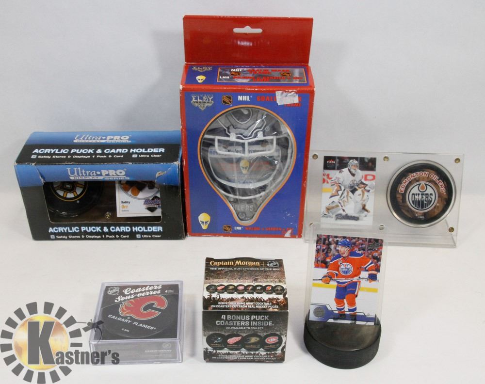 ACRYLIC PUCK & CARD HOLDER BOBBY ORR, OILERS, COASTERS, SEALED ELBYGIFTS GOALIE MASK FRAME & MORE. SPORTS