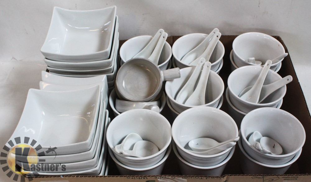 FLAT OF IKEA BOWLS W/ PORCELAIN SOUP SPOONS &