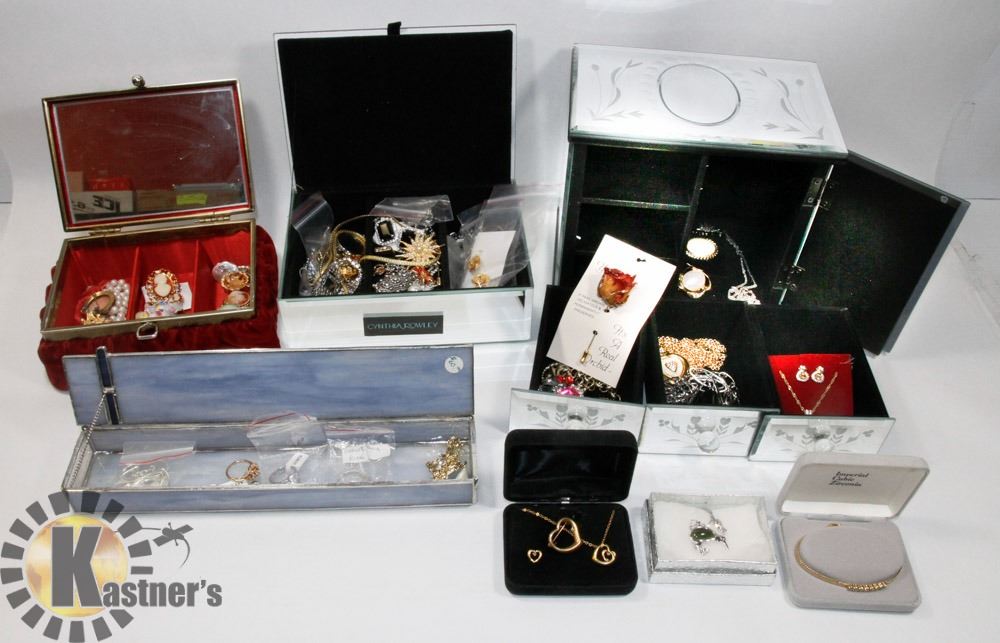 W/BEADS ON LID (VINTAGE) IMPERIAL CUBIC ZIRCONA BRACELET 925, GOLD PLATED, STERLING SILVER, RINGS, A LOT OF CAMEO BROOCHES & SETS & MORE. JEWELRY