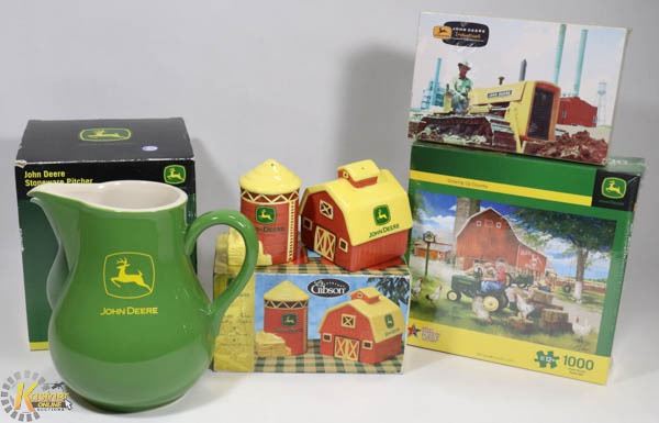 ON THE FARM SALT & PEPPER W/2 SEALED PUZZLES & STONE WARE PITCHER (UNUSED). HOME