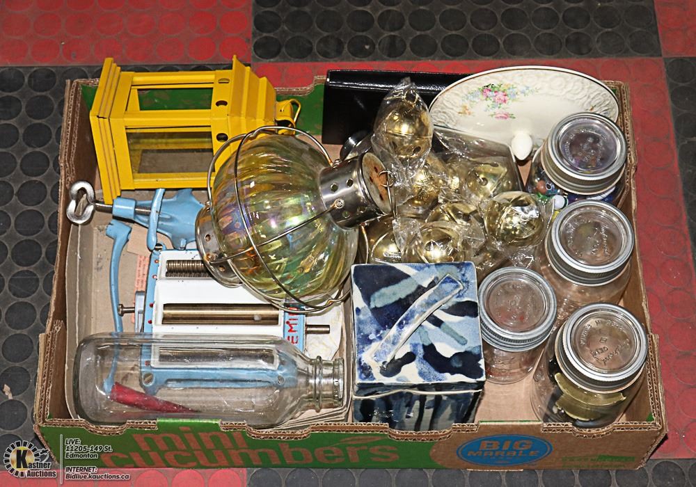 FLAT OF MISC INCLUDING JARS, LANTERN, COOKIE JAR