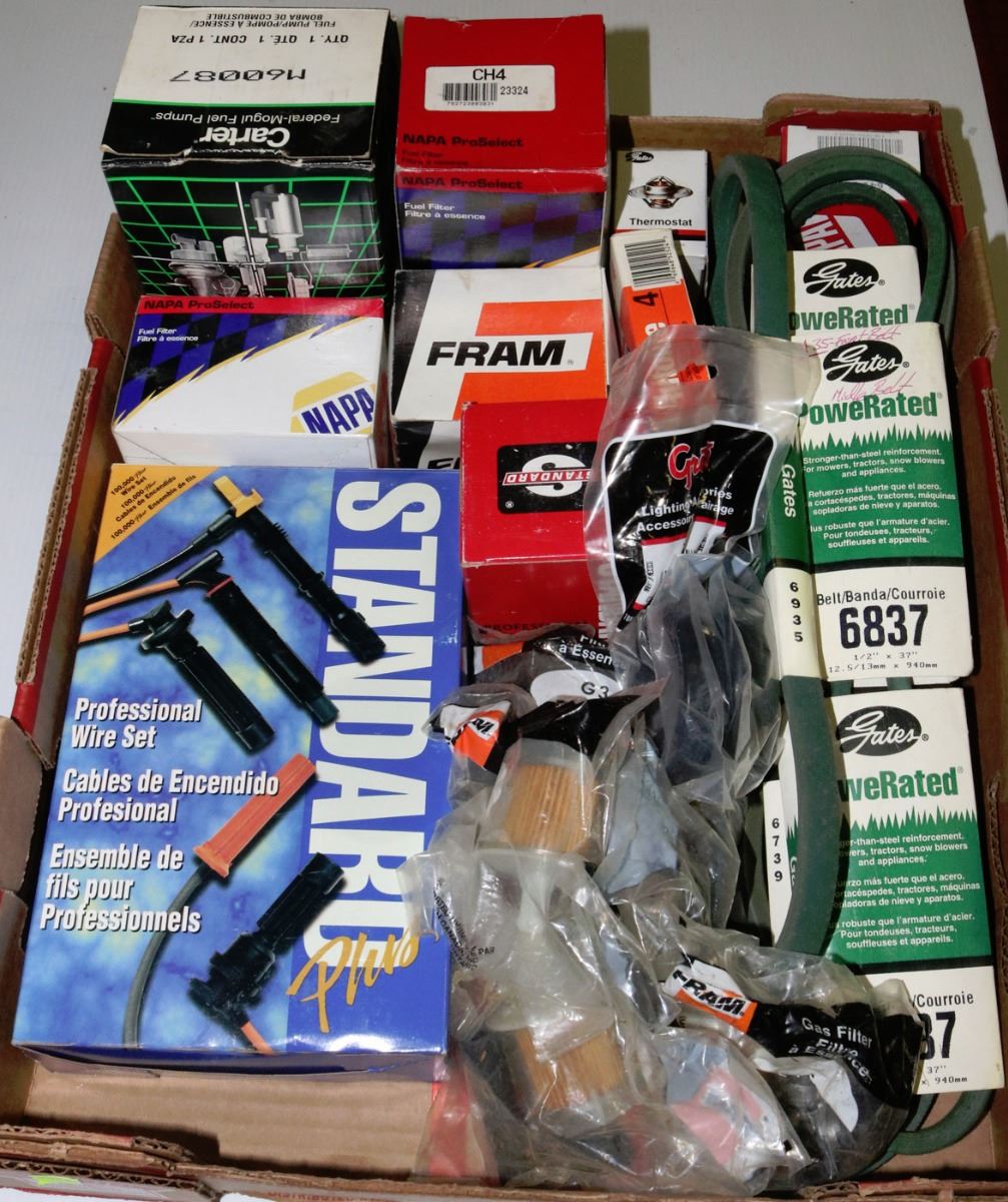 FLAT OF NEW AUTOMOTIVE FILTERS, SPARK PLUG WIRES
