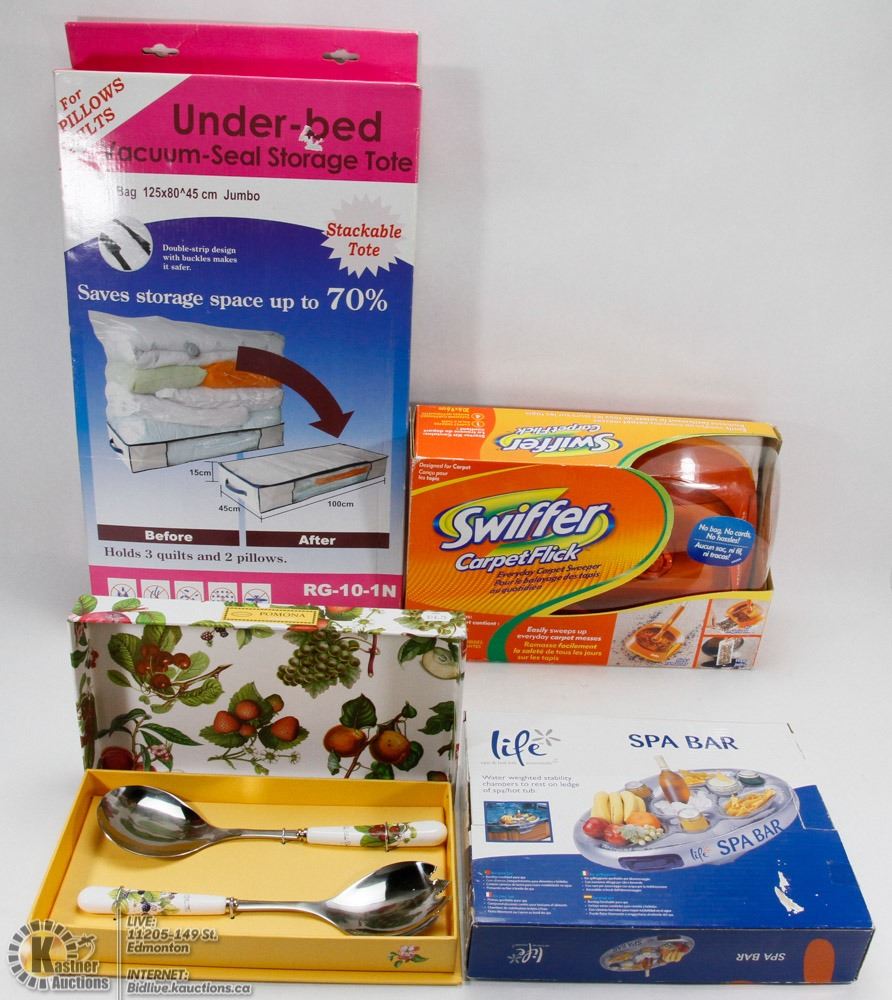 FLICK, LIFE SPA INFLATABLE BAR & SNACK TRAY, PORTMEIRION DOMONA 2 PC SALAD SERVERS, UNDERBED VACUUM STORAGE TOTE. HOUSEHOLD