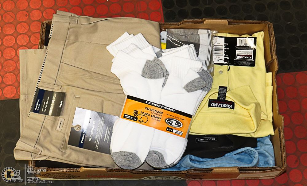 HAYES (38 WAIST) PANTS AND 2 PAIRS OF DARK BROWN PANTS (38 WAIST), SOCKS (7-11), 3 MEN'S SHIRTS (2X L & 1X M), 4 MEN'S BRIEFS (SIZE L) - CLOTHING