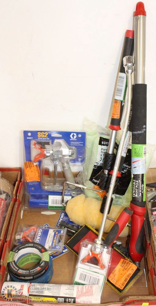 FLAT OF PAINTERS TOOLS, TAPE, ROLLERS, SPRAY GUN