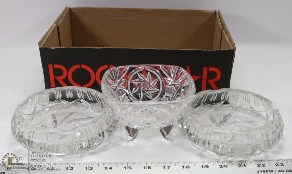 2 LARGE ASHTRAYS, ONE CLUB FOOTED CANDY DISH