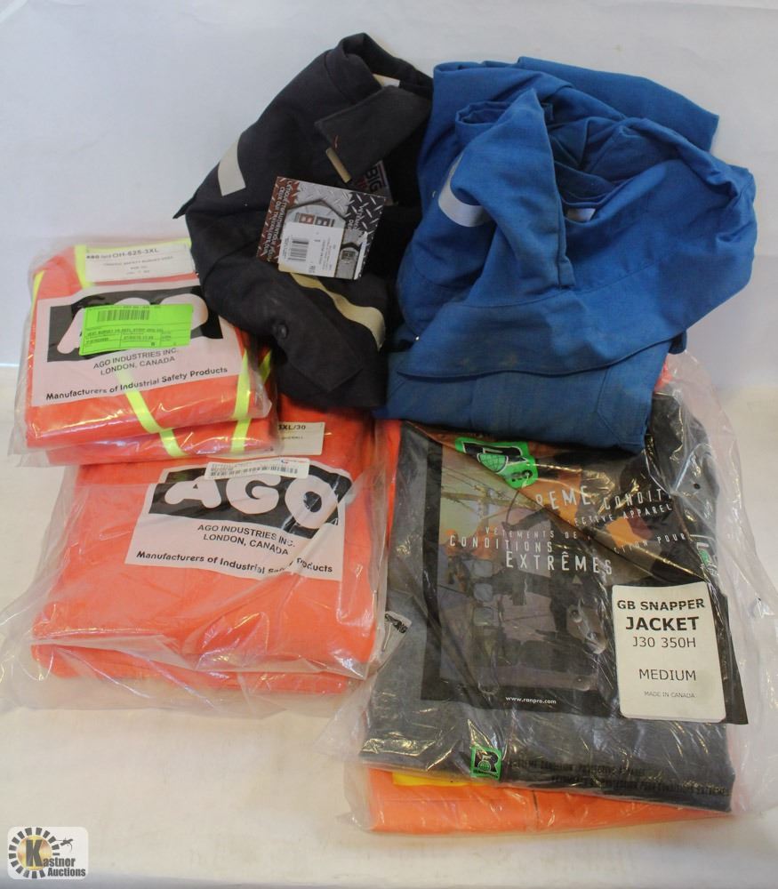 2 AGO VEST, 2 XXXL BIB OVERALLS, SMALL BIG BILL COVERALLS, RAIN JACKETS & MORE